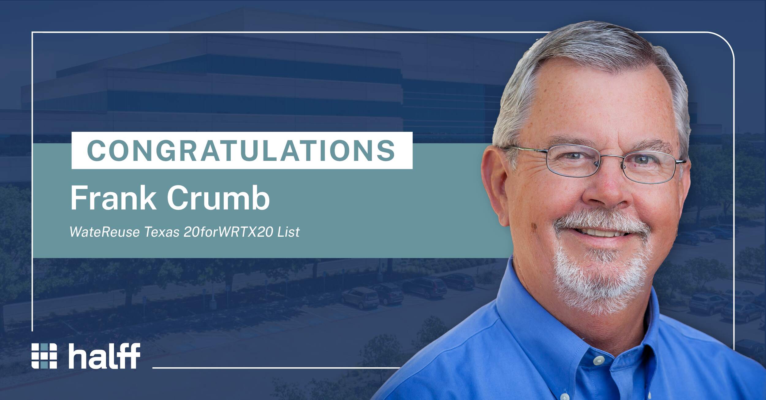 FORT WORTH, Texas — Halff Client Advisor Frank Crumb was named to the WateReuse Texas (WRTX) 20forWRTX20 list.